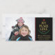 This classically simple design is enhanced with typography rendered in a faux-glitter look for an added touch of sparkle. Replace the sample photo with your own and easily adjust fit and location by using the 'Customise it!' button. The right side has a red 'glitter' accent stripe and a little 'glitter' heart above the words 'Joy Peace Love', which has the look of gold foil. Just below is a simple leaf garland in green faux-glitter. Fully customisable using the easy provided templates are the year, the greeting and family names.