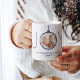 Celebrate the simple joys of the season with this stylish navy blue and white custom photo mug. Text and picture are easy to customise. (IMAGE PLACEMENT TIP: One way to centre a photo exactly how you want is to crop it before uploading to the Zazzle website.) Design features a modern minimalist JOY ornament, chic typography family name & year, and one image of your choice. Makes an elegant Christmas keepsake gift idea for her or him.