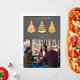 Illustration of tree Christmas tree shaped pizza slices topped with stars. Background is chalkboard inspired. Personalise the name, year, and photo.