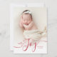 red script personalised photo new born baby birth announcement card. The text and colours can be edited.