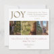 This Christmas card features a simple design with the word "Joy" as it's main focal point and a gold and burgundy color scheme. The verse from Luke 2:10 - "And the angel said to them, “Fear not, for behold, I bring you good news of great joy that will be for all the people"" is situated on the top right in small delicate font. There is room for three family photos as well as an opportunity to write your own greeting. Wishing you all the blessings of the season!