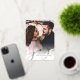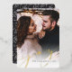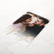 Our simple and elegant holiday photo card features your favourite full bleed vertical or portrait orientated photo, fading to white at the bottom. "Joy" appears as a gold foil script text overlay along with your names or family name, and the year. Cards reverse to a winter leaves pattern.