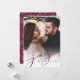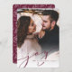 Our simple and elegant holiday photo card features your favourite full bleed vertical or portrait orientated photo, fading to white at the bottom. "Joy" appears as a rich jewel toned plum script text overlay along with your names or family name, and the year. Cards reverse to a winter leaves pattern.
