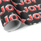 Christmas red JOY text on black background with snow caps and snowflakes.