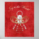 A Christmas theme graphic design of a gold filigree angel with pearls holding a heart with the message 'Joy' on a red chenille background and a 'Joy to the World" banner.