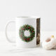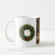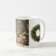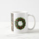 Mug with barnyard animals celebrating Christmas around a tree. On either side are Christmas wreaths.