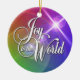 Multi-coloured background with Joy to the world in fancy cursive script., blazing white star to the right. blues greens purple and red background. back has "the Lord hath Come" in the same cursive script.