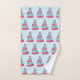 Towel set with a fun and whimsical illustration. Typography design in the shape of a Christmas tree with some christmas ornaments and a star on top. Inside are the words: Joy to the world.