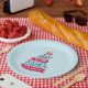Paper plates with a fun and whimsical illustration. Typography design in the shape of a Christmas tree with some christmas ornaments and a star on top. Inside are the words: Joy to the world.