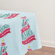 A tablecloth with a fun and whimsical illustration. Typography design in the shape of a Christmas tree with some christmas ornaments and a star on top. Inside are the words: Joy to the world.