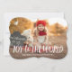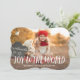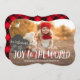 This seasonal photo card design features a hand lettered "joy to the world" font overlay and a cosy buffalo plaid red and black pattern on the reverse side.