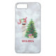 A casemate phone case with a funny illustration. A cute llama wearing black sunglasses and a red santa hat. Standing behind a Christmas tree with festive presents. The word Joy written above his head in a colourful holiday font. Silver bokeh background. Whimsical and fun Christmas themed design.