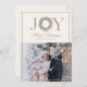 Elegant holiday card featuring the word JOY with a festive Christmas wreath as the “O” and a customisable family photo below. Classic gold accents and timeless script make this design a beautiful way to send warm Christmas greetings to loved ones. Perfect for sharing holiday cheer with style.