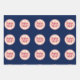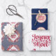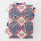 An elegant and classy trio of giftwrap sheets featuring the words joyeux noel in a fancy red calligraphy style lettering font on white. Each of the three designs has the same lettering with different elements around them. The first has traditional Christmas figurines in muted red; gold and blue on dusty blue (a nutcracker; Santa Claus; wrapped gifts; stocking stuffers; pocket watches and more). The second is contained in a circle edged with blue and red on dark blue and the third is just the lettering on stark white. These are ideal for French Christmas party wrap and friends and family that celebrate their xmas in France.