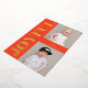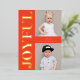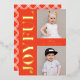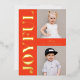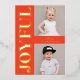 Stylish, modern holiday photo card featuring "Joyful" in trendy gold foil lettering along the left side of the card with an orange background. Personalise the front of the card by adding two of your favourite photos and your name. The gold foil holiday card reverses to a chic white plaid pattern with an orange background. Designed to coordinate with our Joyful Modern holiday collection.