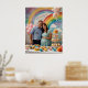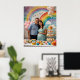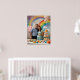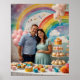 This heartwarming wall art captures a joyful baby shower scene featuring a cheerful pregnant woman and her husband standing by a beautifully decorated table filled with pastel-coloured treats and gifts. They are surrounded by soft clouds, delicate flowers, and gentle stars under a vibrant rainbow and sunshine decor. The mother-to-be, smiling and holding a small teddy bear, radiates happiness as she stands close to her supportive husband. The watercolor effect and soft pastel hues create a warm, inviting atmosphere with a whimsical touch, making it an ideal piece for nursery decor or a special gift celebrating parenthood.