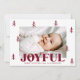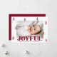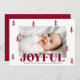 Festive photo Christmas card featuring your horizontal photo surrounded by burgundy hand-drawn pine trees with a white background. "Joyful" is displayed in bold burgundy lettering with your custom greeting and family name shown below. The joyful Christmas card reverses to display an additional photo and a burgundy background with subtle white dots.