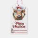 A cheerful Christmas tag showcases a cow adorned with a festive Santa hat and surrounded by a wreath of holly, perfect for adding charm to holiday gifts.