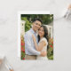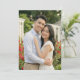 This wedding invitation features a romantic outdoor scene with a couple standing closely together, surrounded by lush greenery and vibrant red flowers. The design showcases a soft colour palette of light blue, beige, and cream, complemented by the rich greens and bright reds of the garden setting. Captured in high-resolution photography, the image emphasizes natural beauty and warmth, creating an inviting and cheerful atmosphere perfect for celebrating love and happiness on your special day.