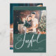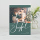 This elegant Christmas holiday card says "Joyful" in modern white script calligraphy. Add two of your favourite family photos and your name. The background is a festive green colour.