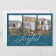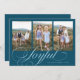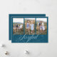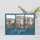 Minimal and modern holiday photo template card featuring 3 photos with a script text that says "joyful" at the bottom. You can also add another picture and message on the back. The background is teal.