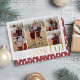 Share holiday greetings with these chic Christmas photo cards featuring five favourite photos in a collage layout (4 square and one portrait/vertical). "Joyful" appears along the bottom in modern gold foil lower case lettering, with your custom holiday greeting, family name, and the year aligned at the left. Cards reverse to a festive pine tree pattern.