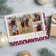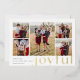 Share holiday greetings with these chic Christmas photo cards featuring five favourite photos in a collage layout (4 square and one portrait/vertical). "Joyful" appears along the bottom in modern gold foil lower case lettering, with your custom holiday greeting, family name, and the year aligned at the left. Cards reverse to a festive pine tree pattern.