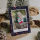 Share holiday greetings with these photo Christmas cards featuring your favourite photo set on a background of holiday flowers and botanicals in festive red and green on deep midnight blue. An editable message area lets you customise your holiday greeting. Add your family name or names beneath. Cards reverse to solid sage green.
