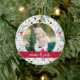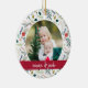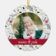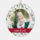 Festive photo Christmas ornament features a favourite photo on each side, framed by a holiday botanical pattern. Personalise with a custom caption on each side; shown with names in handwritten script and the year on the reverse. Coordinates with our Joyful Type holiday collection.