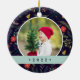 Festive photo Christmas ornament features a favourite photo on each side, framed by a holiday botanical pattern on a rich midnight blue background. Personalise with a custom caption on each side; shown with names in handwritten script and the year on the reverse. Coordinates with our Joyful Type holiday collection.