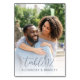 This wedding table card features a heartwarming photograph of two individuals embracing in an outdoor setting, capturing a moment of joy and affection. The design includes a soft colour palette with natural tones like greens, greys, and muted clothing hues, creating a serene and romantic atmosphere. Elegant typography at the bottom highlights "table 12" in cursive script, followed by names in a clean sans-serif font, adding a personalised touch to the celebration. Perfect for weddings or intimate gatherings, this card combines photographic realism with simple yet sophisticated styling to enhance your event's ambiance.