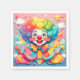 A vibrant cartoon clown with a contagious smile, surrounded by a whimsical world of colourful shapes, stars and clouds. The clown's curly hair and outfit are a kaleidoscope of pastel colours, matching the playful atmosphere. The image excludes happiness and carefree joy, perfect for bringing a smile to anyone's face.