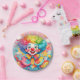 A vibrant cartoon clown with a contagious smile, surrounded by a whimsical world of colourful shapes, stars and clouds. The clown's curly hair and outfit are a kaleidoscope of pastel colours, matching the playful atmosphere. The image excludes happiness and carefree joy, perfect for bringing a smile to anyone's face.