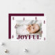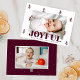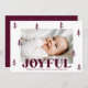 Festive photo Christmas card featuring your horizontal photo surrounded by merlot-purple hand-drawn pine trees with a white background. "Joyful" is displayed in bold merlot-purple lettering with your custom greeting and family name shown below. The joyful Christmas card reverses to display an additional photo and a merlot background with subtle white dots.