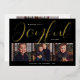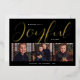 This chic custom "Joyful" Christmas holiday card features a unique layout and minimalistic design with a 3 photo spaces on the front and modern and elegant script typography in real gold foil with black background color. Personalize the simple last name or family signature and the year, and choose to include an additional message on the back of the card. An additional photo space is also included on the back. Photo credit: Livia Plaskey Photography @liviaplaskeyphotography