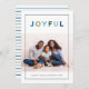 This modern and minimal holiday photo card design features a simple photo frame with "JOYFUL" in modern sans serif lettering that is styled in cool blue and green colours. Personalise with your favourite landscape photo (5 x 7 ratio), your family member names, and the year. The coordinating pattern of colourful horizontal stripes dresses up the back of the card. Colours include: cobalt blue, olive, steel blue, hunter grey, aqua blue, indigo, and accents of dark grey.
