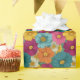 This vibrant floral wrapping paper features a playful and whimsical design with densely packed, colorful flowers in shades of magenta, orange, teal blue, pink, white, and mustard yellow. The seamless pattern creates a continuous flow, perfect for adding a cheerful touch to any gift. Rendered in a modern, flat vector style, the bold colors and simple forms evoke feelings of warmth and positivity, making it ideal for celebrations or special occasions.
