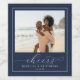 This wedding wine label features a joyful beach scene with two individuals, framed by a navy blue and white border that highlights the vibrant photograph. The design uses natural tones of blues, sandy beige, and earthy browns, complemented by a soft peach hue in the foreground. Elegant cursive typography spells "cheers," followed by customizable names and date in bold serif and simple sans-serif fonts, creating a structured yet intimate feel. Perfect for celebrating special moments, this label captures a candid, cheerful mood ideal for commemorating weddings or anniversaries.
