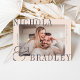 Share the news of your engagement with these elegant announcement cards featuring a horizontal or landscape orientated photo with your names aligned at the corners in classic lettering, slightly overlapping your photo and extending past the edges of the paper for a modern look. Personalise with two lines of custom text along the sides for additional details or your wedding website.