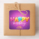 Unleash a pop of party on any package with this vibrant square sticker! A rich purple background sets the stage for the dazzling "HAPPY" in playful, multi-coloured bubble letters, crowned with festive star confetti. Below, "birthday" dances in elegant script, creating a perfect balance of fun and flair. The placeholder name is completely customisable, allowing you to tailor this design for any celebration.