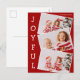 Modern red Christmas photo collage postcard with 3 kids photographs in a fun overlapping snapshot pattern with white border and the word Joyful written vertically down the side. Find your three favourite pictures for these cute family holiday postcards.