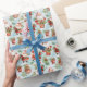 Colourful wrapping paper showcases cheerful Santas amidst festive decorations like pine trees, ornaments, and gifts, perfect for holiday gift-giving and celebrations.
