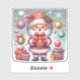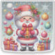 A cheerful Santa Claus, dressed in a vibrant red suit, holds a beautifully wrapped present surrounded by colourful ornaments and sparkling snowflakes. The festive atmosphere radiates warmth and joy, perfect for celebrating the Christmas season.