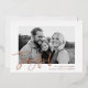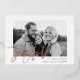 Modern foil holiday card featuring "Joyful" in hand-lettered rose gold foil script with a white background. Personalise the front of the card by adding your favourite horizontal photo and your names The reverse side of the card features a black and white modern Christmas tree pattern.
