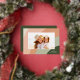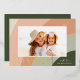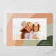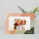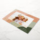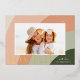 A chic and elegant holiday card design featuring a single horizontal or landscape-oriented photo in a unique arched layout, framed by organic stripe shapes in soft shades of peach and forest green. "Joyful" appears beneath your photo in understated type, with the year at the top. Personalize with your family name at the lower right for the perfect finishing touch to these nature-inspired Christmas 2022 photo cards.