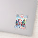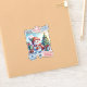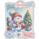 A charming Christmas sticker showcases a cheerful snowman holding a warm drink, surrounded by colourful presents. The backdrop features a festive tree adorned with ornaments, capturing the joyful spirit of the holiday season with playful stamps.