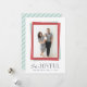 Modern holiday photo card features your favourite vertical photo framed by geometric elements in cranberry red and icy mint green. "Be Joyful" appears beneath in a combination of handwritten script and block lettering. Personalise with your family names and the year in muted midnight blue for a chic statement. Cards reverse to ice and white diagonal stripes.