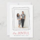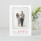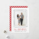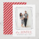 Modern holiday photo card features your favourite vertical photo framed by overlapping geometric borders in crisp black. "Be Joyful" appears beneath in a combination of handwritten script and block lettering in vibrant holiday red. Personalise with your family names and the year. Cards reverse to red and white diagonal stripes.