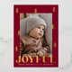 Festive photo Christmas card featuring your vertical photo surrounded by hand-drawn gold foil pine trees with a burgundy background. "Joyful" is displayed in bold gold foil lettering with your custom greeting and family name shown below. The joyful Christmas card reverses to display an additional photo and a burgundy background with subtle white dots.