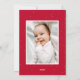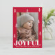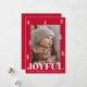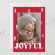 Festive photo Christmas card featuring your vertical photo surrounded by white hand-drawn pine trees with a red background. "Joyful" is displayed in bold white lettering with your custom greeting and family name shown below. The joyful Christmas card reverses to display an additional photo and a red background with subtle white dots.